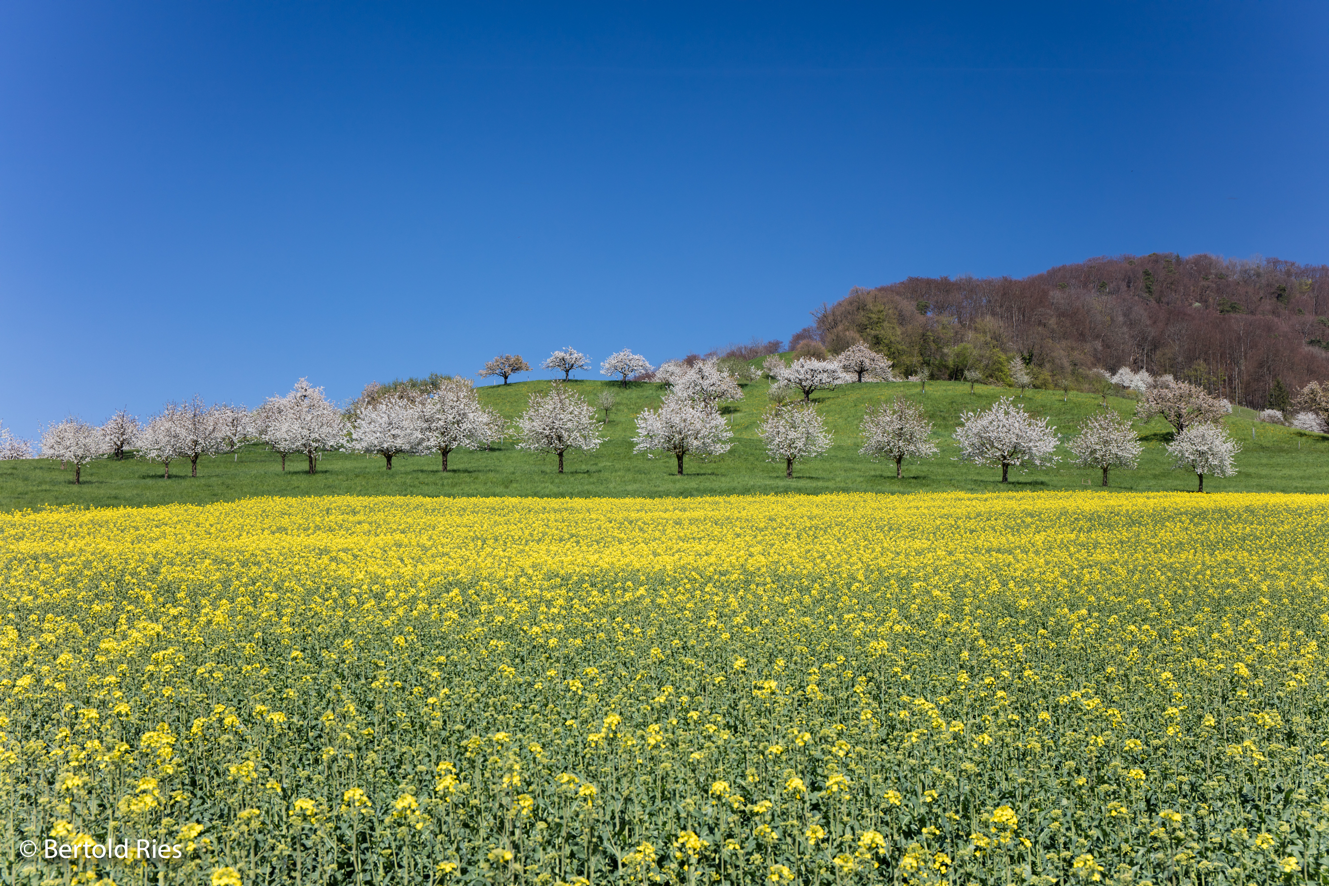 White cherry blossom, yellow rape and blue sky in the Canton Basel-Landschaft in Switzerland. Springtime greetings!