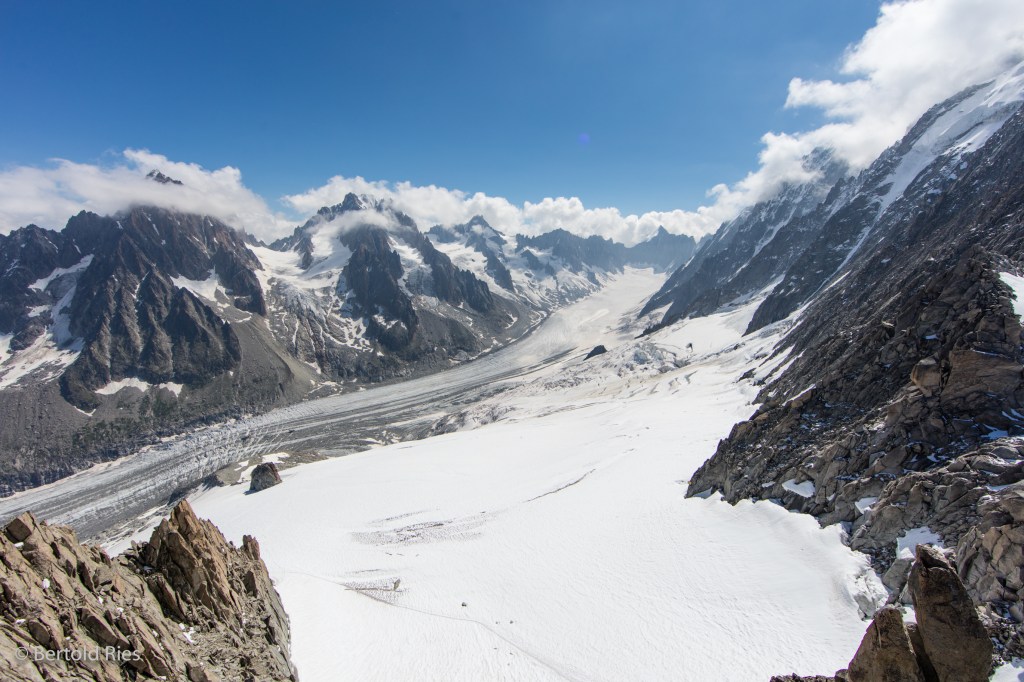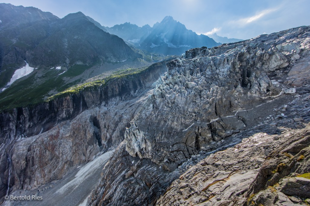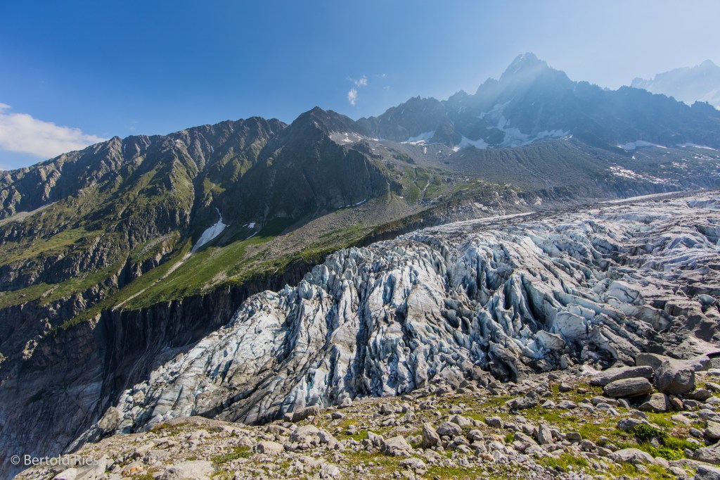Today I’m sharing shots of a glacier in the French Alps: the Glacier d’Argentière. This glacier belongs to the Mont Blanc massif and is about 9 km long. At good 2’000 meters above sea level it’s tongue reaches a very steep edge. It was pretty impressive to have this mass of ice right in front of my lense with its spikes sparkling in the back light of this sunny summer morning.