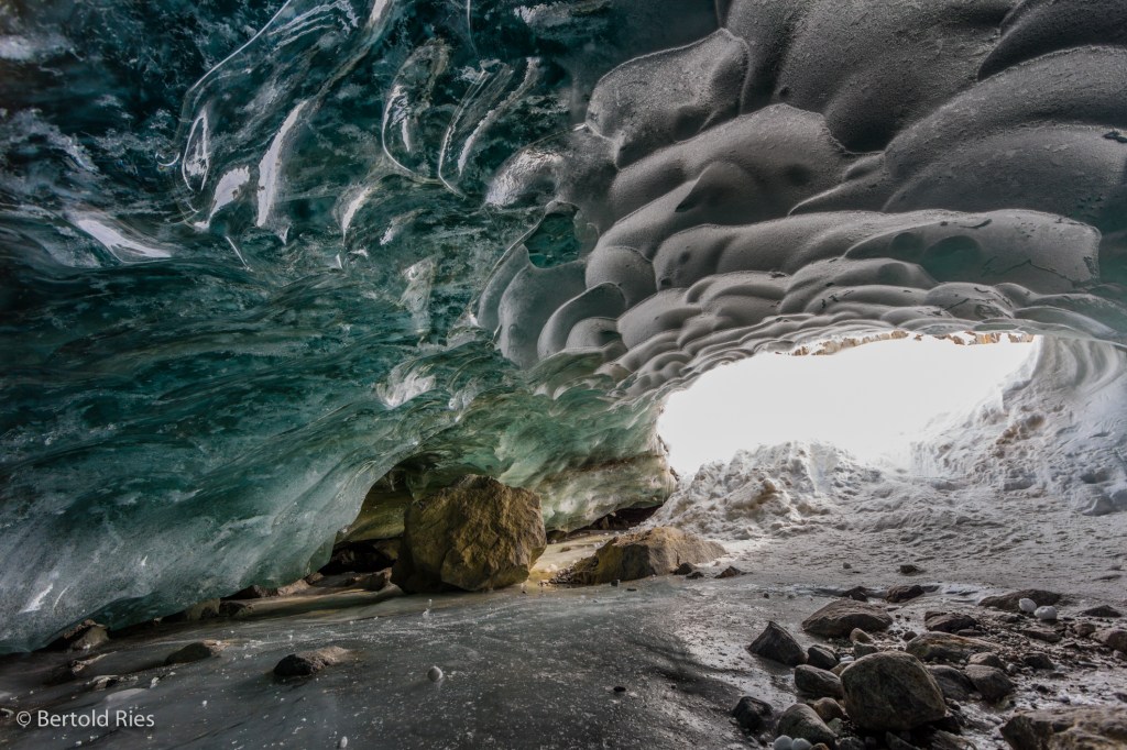 After a roughly two hours hike into the valley and some ascent towards the upper side of the moraine the little entrance appears. A few steps down, a cathedral in green opens up. Quite spooky is that one can hear the water flowing underneath the icy ground of the cave which is also filled with rocks the glacier was carrying along.